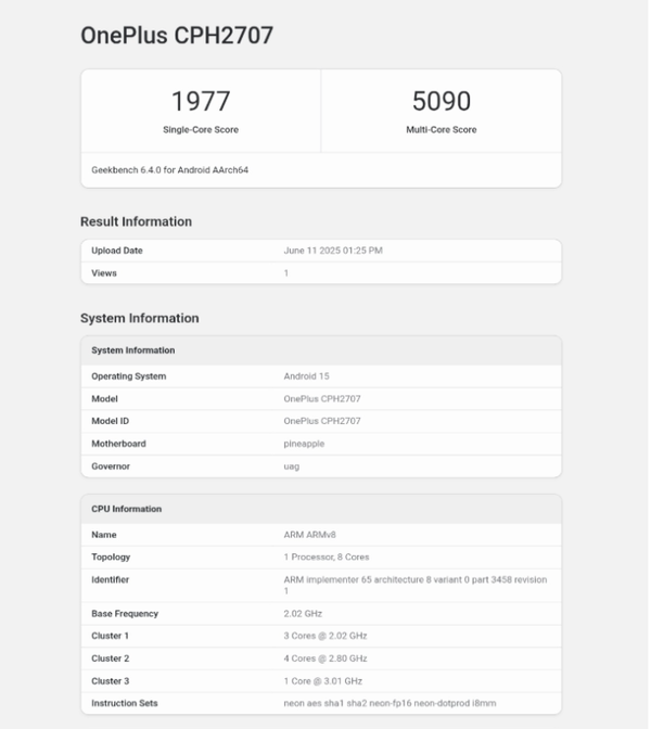 据Geekbench数据显示,印度版OnePlus Nord 5(型号为CPH2707)在单核测试中取得了1977分的成绩,而在多核测试中则达到了5090分。该机将搭载高通骁龙8s Gen 3芯片,主频高达3.01 GHz,并配备Adreno 735 GPU验。同时,OnePlus Nord 5还将预装Android 15操作系统,并提供12GB RAM的选项,满足用户对多任务处理和大型应用运行的需求。